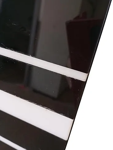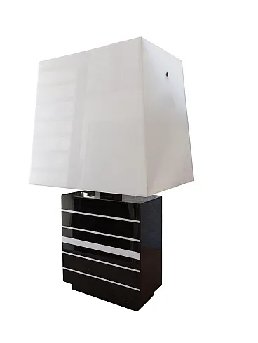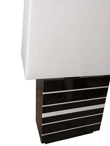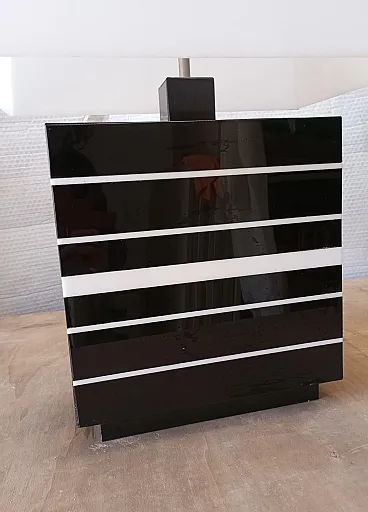 The black lucite base features equidistant horizontal white lines that create a captivating graphic effect. The central line, wider than the others, acts as a dominant visual element, breaking the symmetry and adding dynamism to the design in a graphic play of black and white contrasts.