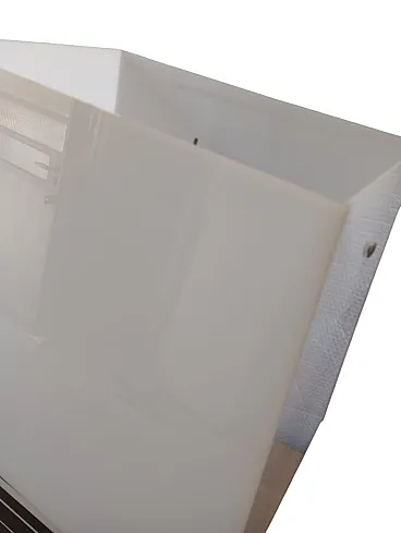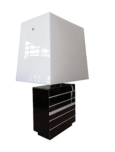 The square and well-proportioned lampshade is made of milky white lucite, a material that softly diffuses light, creating a soft atmosphere. Its milky opaqueness elegantly contrasts with the glossy, striped base.