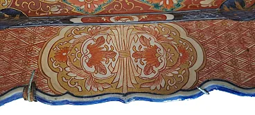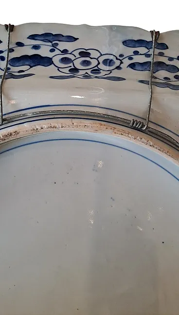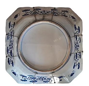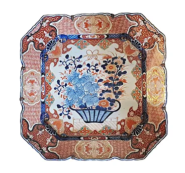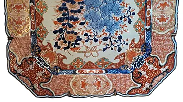 This exceptional pair of imarious porcelain dishes, of considerable size, embodies the elegance and chromatic wealth typical of this renowned Japanese manufacture. The dishes have an octagonal shape with elegantly lobed edges, creating a sinuous and sophisticated profile. The decoration, performed in polychrome, is a magnificent example of the IMARI style. The design is divided into two distinct levels. In the center, a medallion contains a splendid floral composition, dominated by large leaves and stylized flowers painted in a lively cobalt blue under the nail polish. This central reason is enriched by floral details in iron and gold red, which add depths and brightness. The use of red, blue and gold is a distinctive signature of the IMARI porcelain, making these pieces immediately recognizable. The large external tense, also octagonal in shape, is decorated with a grid of alternating reserves and panels. These panels depict Kakiemon -style floral and vegetable motifs, characterized by more delicate and transparent use of color, in contrast with the saturation of the central medallion. The decorations are finished with gold profiles, which enhance every detail. The upper edges are characterized by a flounced shape with lobes that follow each other in the shape of a fan, decorated with stylized flowers and leaves. The back of the dishes reveals the quality and authenticity of the pieces. It is decorated with floral motifs and clouds painted in blue under nail polish.