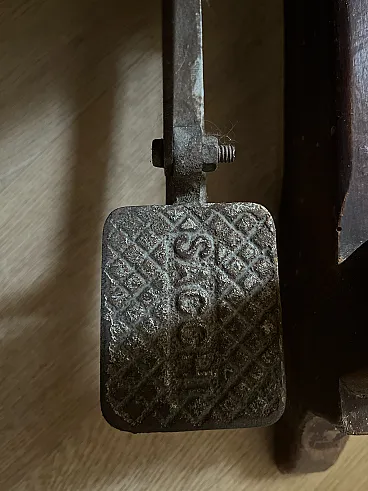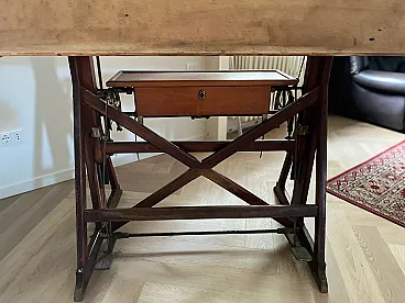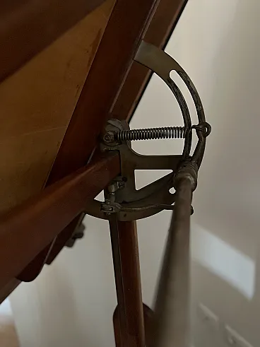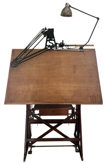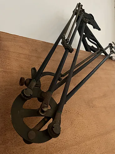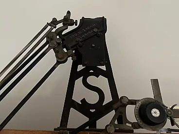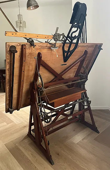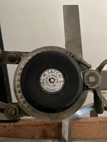 Large original techni -technigraph of the renowned Torinese company Ing. M. Sacchi S.r.l, founded in 1922. Metal and cast iron structure with inclinable wooden top as well as the complete stand base with a storage drawer and two drive pedals. The Tecnigrafo, complete with original plate, stands out for the large "s" monogram of the manufacturer on top of the floor, where the adjustable light and arm with the iron lines connected to the Goniometer (a missing line) are also placed.