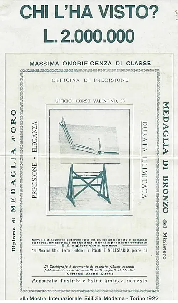 The Sacchi company was founded in Turin in 1922 by Eng. Michelangelo Sacchi and made his debut with a real innovation: the spring technigraphs with wooden table, tools that allowed designers and architects a precision and a convenience of use until then unpublished. The robustness of the structures, the reliability of the mechanisms and the artisan care in details made the techni -jets among the most sought after in Italy and abroad, becoming a symbol of quality for entire generations of professionals of the technical and industrial design. Over the years, the company not only maintained a leading role, but also received official awards, such as the Turin Industrial Union Prize in 1995, testifying to the solidity and impact on the local production fabric and as a founding partner of the Amma (industrial union).