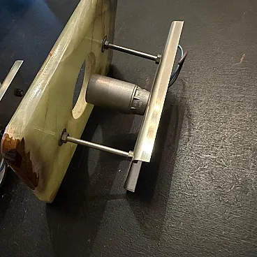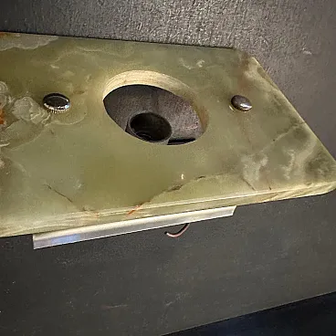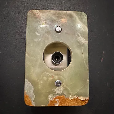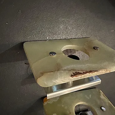 These 1970s Space Age green and brown onyx marble Italian wall sconces are elegant examples of mid-century modern design with a unique Space Age twist. Each sconce features a rectangular onyx marble panel, showcasing the natural, earthy tones and intricate veining of the stone. The panel is arranged on a metal base that creates depth and texture, adding visual interest to the sconces. The onyx marble has a rich, green color and warm brown color with varying shades and patterns, which are unique to each piece. The lighting element is discreetly housed within the marble panel, allowing the light to softly diffuse through the stone, creating a warm and ambient glow. The combination of luxurious onyx marble with the sleek metal accents makes these sconces a stylish and sophisticated addition to any interior. They are in perfect condition and in working order