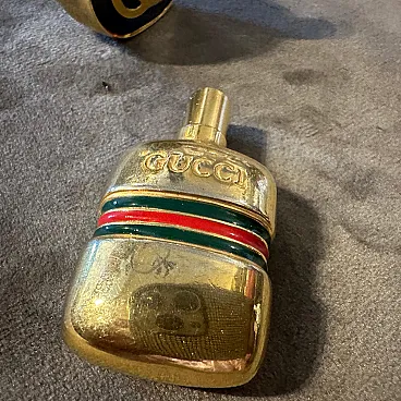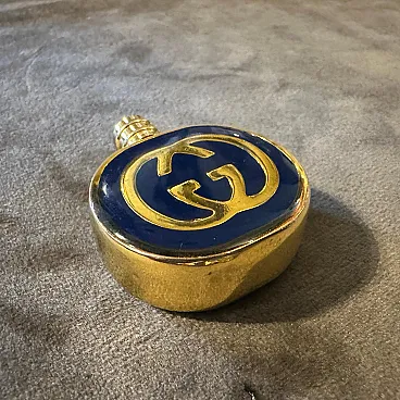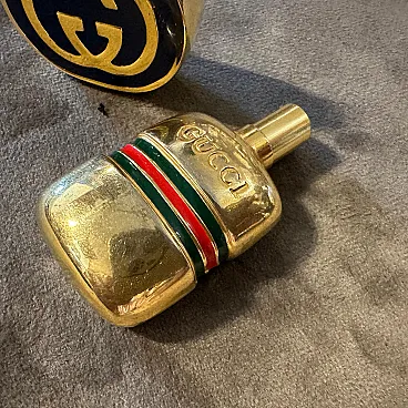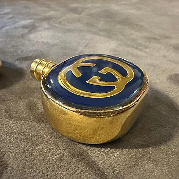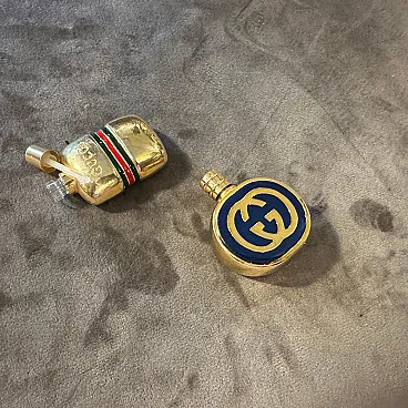 Vintage 1980s Gucci Modern Brass and Enamel Scent Bottles (Set of 2) A rare and elegant set of two vintage perfume bottles from the iconic luxury brand, Gucci. Dating from the 1980s, these pieces are a perfect representation of the era's bold style and Gucci's timeless design. Each bottle is crafted from polished brass with a heavy, substantial feel. The design of the bottles features two distinct and classic Gucci motifs: Circular Bottle: This bottle showcases the famous interlocking "GG" logo in a prominent gold-on-navy enamel design. The logo is set within a round, flat face, making it a striking piece of miniature art. Rectangular Bottle: This bottle features the classic Gucci "Web" stripe—a bold red and green enamel band that wraps horizontally around the bottle's center. The word "GUCCI" is elegantly embossed in a diagonal pattern on the top face, a subtle yet unmistakable mark of the brand. Both bottles are designed with a screw-top lid that can be opened to reveal a small glass vial and a plastic dabber, indicating they were intended for holding and applying perfume or cologne. They are in excellent vintage condition, showing a beautiful patina on the brass consistent with their age. The enamel remains vibrant and intact on both pieces. These are not just functional items but collectible luxury accessories. They would be a perfect addition to a vanity, a dresser, or a collection of vintage designer objects. A fabulous find for any Gucci enthusiast or collector of fine perfume bottles. dimensions of the round bottle height cm 4.2, diameter 3.2 depth cm 1