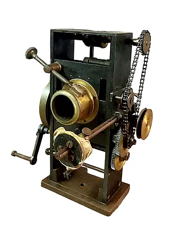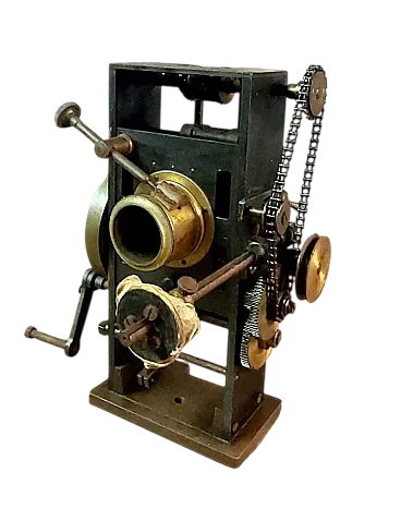 Machine for the production of 35 mm pound films, probably produced between 1900 and 1920. Operation: this type of machine was manual and used a 35 mm crank and film, the standard format introduced by Eastman Kodak. Historical competition: projects similar to those used for the first film projects, such as those held by the Lumière brothers in 1895. Features: The machine is made in a metal phone and has an assembly and chain system for the movement of the vehicle. A film and the coil. The conditions are, whatever the photos, they must be used so that the ingredients are good. Measure h 30