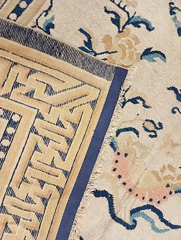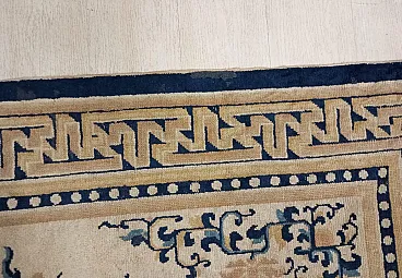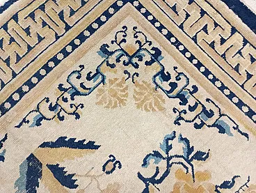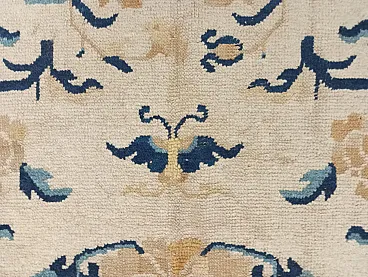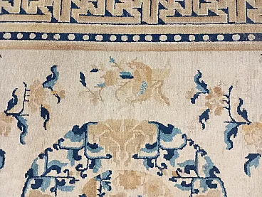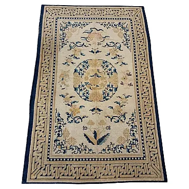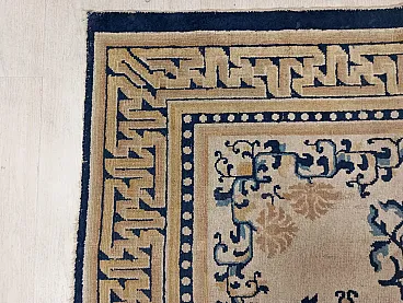 Chinese carpet half 19th century, hand -knotted in wool, color of the beige background with final border in blue, color that characterizes Chinese rugs. It has a central medallion adorned with peonies, and other symbolic flowers. Its border is very particular and unusual we find "thunder", a symbol of infinite luck. The carpet described is an ancient carpet from the Ningxia region (Ninghsia), an area historically renowned for the production of high quality rugs in the province of Kansu (current Gansu), located in Western China. Ningxia reached its peak as a weaving center of rugs between the eighteenth and nineteenth centuries, when local craftsmen developed a distinctive style characterized by refined motifs, natural colors and advanced bored techniques.