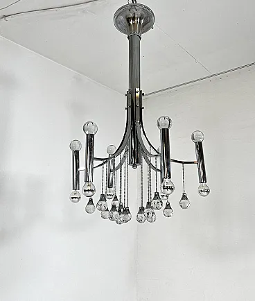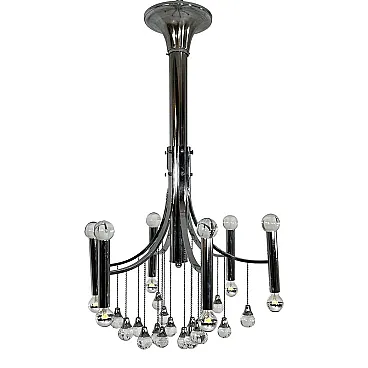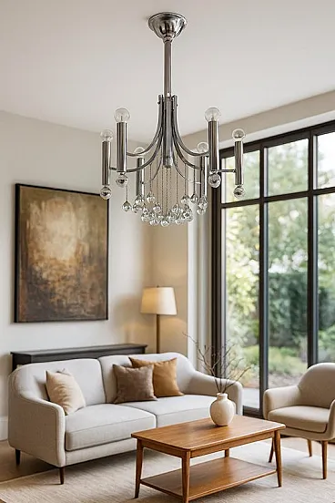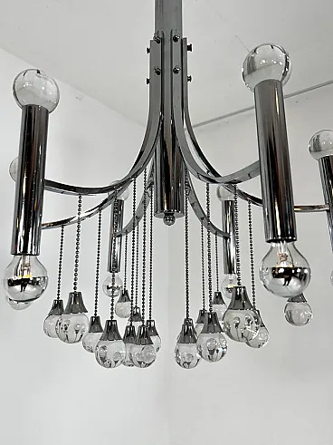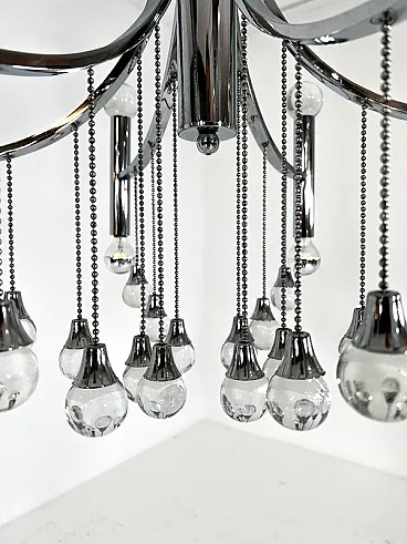 A striking chrome and art glass chandelier in the style of Gaetano Sciolari, crafted in Italy during the 1970s. A striking chrome and art glass chandelier in the style of Gaetano Sciolari, crafted in Italy during the 1970s. With its elegant cascade of polished chrome arms and glass drops suspended by fine chains, this piece exemplifies the glamour and innovation of Space Age Italian lighting. Six vertical chrome rods support light bulbs at the ends, while multiple tiers of faceted crystal drops hang below, catching and reflecting light with dazzling effect. The sleek metallic structure contrasts beautifully with the softness of the cut glass, offering a unique sculptural presence. Ideal for a grand entryway, dining room, or modern living space, this chandelier blends mid-century modern geometry with the opulence of Hollywood Regency design. Dimensions: Approximately 19.6ʺ Diameter × 31.5ʺ Height (50 cm x 80 cm) Lighting: 6 bulbs (E14 small screw base) Sciolari chandelier, chrome chandelier, Space Age lighting, crystal drop chandelier, Italian mid-century, Hollywood Regency, 1970s Italian lighting, Gaetano Sciolari style, modernist chandelier.
