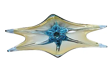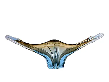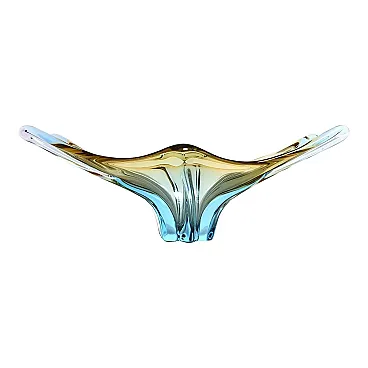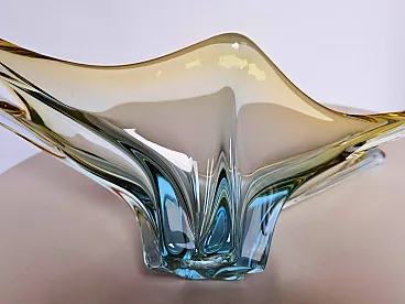An amazing Large Venetian Murano Style glass object in an unusual design and a pretty beautiful color. An amazing Large Venetian Murano Style glass object in an unusual design and a pretty beautiful color. A highly decorative piece useful as center piece, bowl, fruit bowl or catchall. Italy, 1970s. This is a vintage Murano Style glass bowl characterized by its elegant and flowing form. The bowl features a smooth, curvilinear shape with a slightly asymmetrical design, typical of artistic glassware from Venice. Its colors include subtle shades of beige, cream and hints of aquamarine, creating an iridescent and luminous effect. The craftsmanship showcases traditional Murano glass techniques, with a polished surface and intricate color blending. The glass appears to be hand-blown, evident in its organic shape and delicate finish. This piece exemplifies the artistry and finesse of Murano glassmaking, making it a unique and collectible decorative item.
