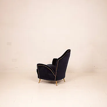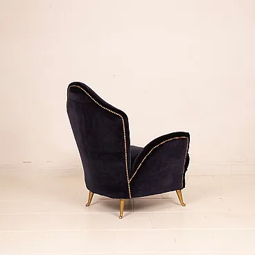 The bordering with files of brass nails performed by hand, underlines the sinuous profile of the armchair, enriching it with a precious decorative detail, in perfect dialogue with tapered feet in golden aluminum, typical of the isa production of that decade.