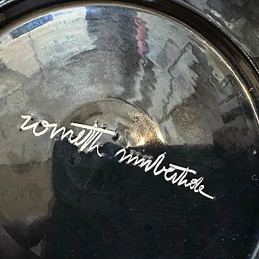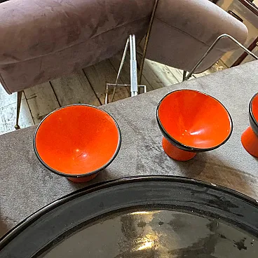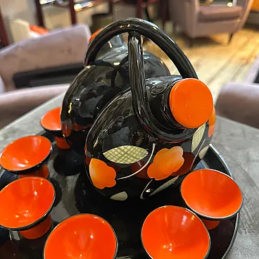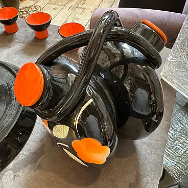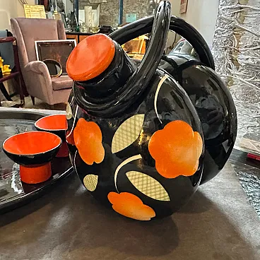 This striking mid-century modern Rosolio set is a fantastic example of Italian ceramic artistry from the 1950s, created by the renowned Rometti manufactory. The set, featuring a dramatic and sculptural design, consists of two conjoined bottles, six matching glasses, and a serving tray, all crafted from high-gloss black ceramic. The bottles are adorned with vibrant, hand-painted orange floral motifs and abstract patterns, while the rims of the bottles and the interior of the glasses are finished in a brilliant, contrasting orange. The bottles are connected by an elegantly twisted handle, forming a singular, eye-catching centerpiece. The six small glasses mimic the color scheme, with their black exteriors and brightly colored orange interiors. The entire set rests on a matching black ceramic tray. This set is a testament to the period's playful yet sophisticated design sensibilities. It is signed on the bottom of the tray with the Rometti mark, confirming its authenticity. Perfect for entertaining or as a decorative statement piece, this vintage Rosolio set is in very good vintage condition with small signs of use and wear on the glasses.