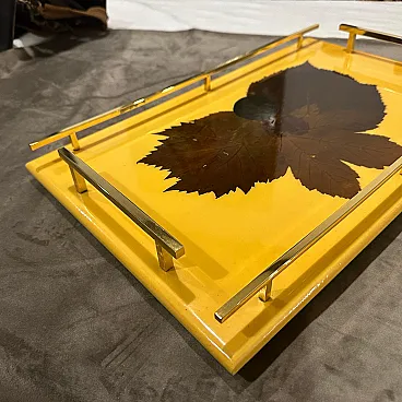 This captivating serving tray from the 1960s is a fantastic example of Italian mid-century modern design, blending natural elements with a bold, graphic aesthetic. The rectangular tray features a glossy, sunshine-yellow lacquered wood surface, which provides a vibrant backdrop for the central design element: a meticulously preserved, large dried leaf encased within the lacquer. The deep, rich brown of the leaf creates a stunning contrast against the bright yellow. The tray is framed by sleek, polished brass handles that run along all four sides, adding a touch of glamour and structure to the organic design. The handles are both functional and decorative, making it easy to carry while also enhancing the tray's sophisticated look. This tray is a statement piece perfect for serving drinks or appetizers, or simply for display on a coffee table. The bottom is signed, indicating it is an authentic design piece, it's In very good vintage condition,