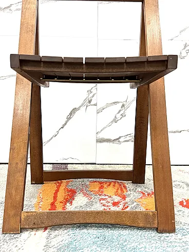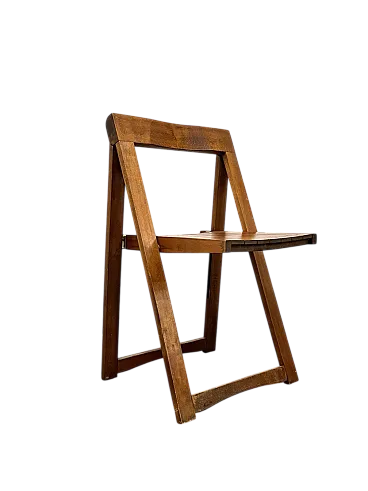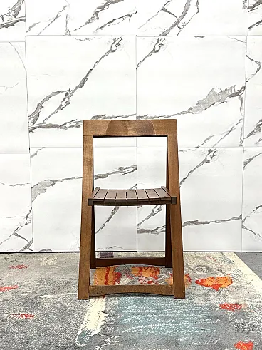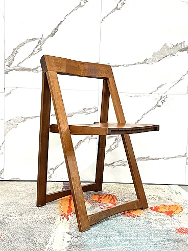 Iconic folding chair "Trieste" model, designed by Aldo Jacober for Alberto Bazzani in the 1960s. Made of solid wood, it is characterized by the geometric and essential design, with a stand and seat structure consisting of parallel strips. Its clean and functional line perfectly embodies the aesthetic of post -war Italian design, with a balance between practicality and formal refinement. The chair is folding, therefore extremely practical and versatile, suitable for both domestic environments and exhibition spaces. An example of authentic vintage design, now very refined by collectors and enthusiasts.