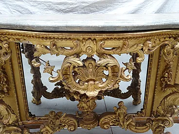 Carved gilded Piedmontese console in plaster, wood and mirro, '800