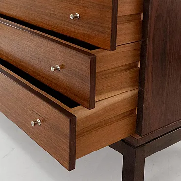 The cabinet has a clean and straight silhouette with five large drawers, each with thin round metal knobs. The raised base has thin and square legs, which give lightness to the shape, balancing the weight and intense shades of the rosewood. The veins of the wood show a vividness and a warmth; The finish shows a character consistent with the time, typical of the refined Italian vintage furniture of the 60s-70s.