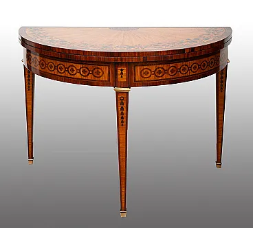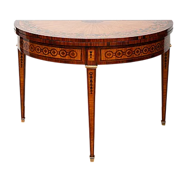 Description: Demi Lune Game Table in fine exotic woods belonging to the second half of the nineteenth century. The plane has the classic crescent shape with a floral motif inlay along the entire edge. The undergoing band is highlighted by a dense inlay with a geometric motive and is connected to obelisk feet ending with bronze socks. The plan is folding and hides a storage compartment inside. Conditions: Restored by our artisan masters with traditional hill and handmade alcohol method. Origin: France 19th century. Measures: 100x50 H77cm. Document: certificate of authenticity. Assistance: we are at your disposal for further clarifications or photographic details Shipping: throughout Italy Europe and the rest of the world at very low prices in maximum safety and traceable. The shipment will be agreed privately and will not be high cost. We wish you a good day. Borrelli Antiquity.