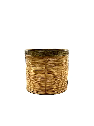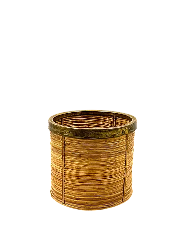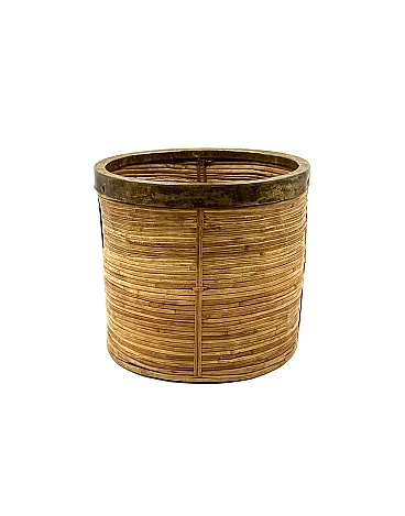 Hollywood Regency style basket inspired by Gabriella Crespi Italy, about 1970 Wicker, brass H 22 cm - 25 cm Diam. Conditions: Excellent, no flaw.