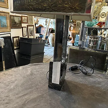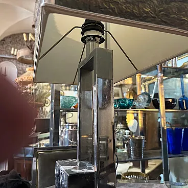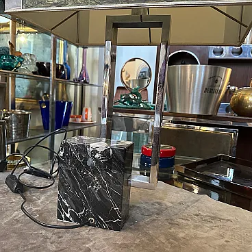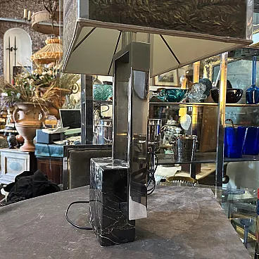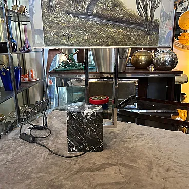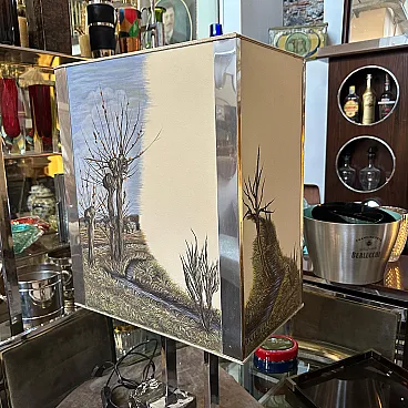 This elegant and rare 1970s modernist table lamp is a striking example of Banci Firenze's masterful craftsmanship and innovative design. The lamp features a sleek, chromed metal frame that rises from a substantial, rectangular base of veined black marble. The contrast between the polished, reflective metal and the natural, weighty stone creates a beautiful juxtaposition of materials. The most unique and captivating element is the original hand-painted lampshade. All sides of the shade are adorned with a detailed landscape painting, likely a depiction of a field with trees, while the other three sides are a creamy off-white. This artistic detail makes the lamp not just a source of light, but a piece of fine art. The lamp is in very good vintage condition, with minor signs of wear consistent with age. It would be a stunning addition to any mid-century, modernist, or contemporary interior, and is sure to be a conversation starter.