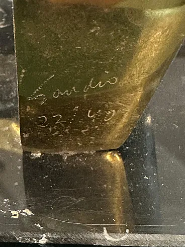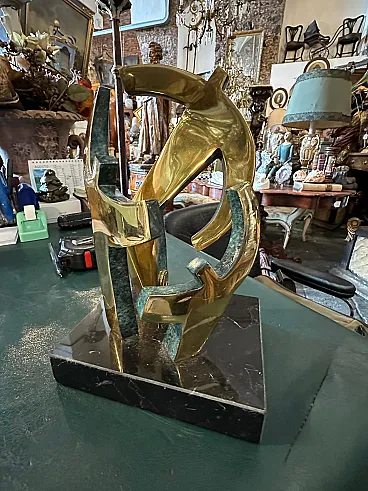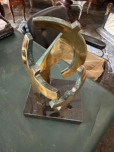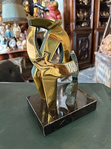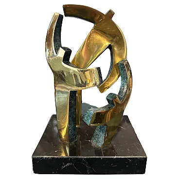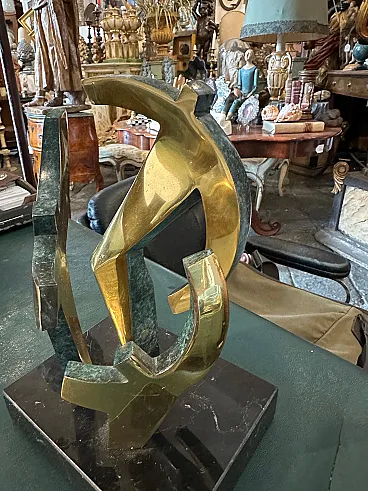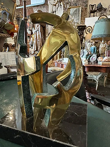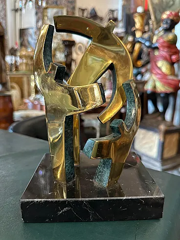 This stunning vintage sculpture, created in the 1990s, is a beautiful example of abstract expression. The piece is crafted from gilded bronze with a striking green patina on some of the surfaces, which beautifully contrasts with the polished gold finish. The abstract form, which hints at three happy childs, is dynamic and fluid, capturing a sense of motion and energy. The sculpture is mounted on a solid, rectangular base of black marble with elegant white veining, providing a stable and sophisticated foundation. The artist's signature, "Gaudio," is clearly etched into the bronze, along with the numbers "22/40," indicating that this is a limited edition piece. This makes it a unique and collectible work of art. This sculpture would make a perfect addition to any modern or contemporary decor, serving as a captivating centerpiece on a console table, bookshelf, or desk. It is in excellent vintage condition with a beautiful aged patina that adds to its character. This is a rare and unique piece perfect for art collectors and anyone looking to add a touch of timeless elegance to their home or office.