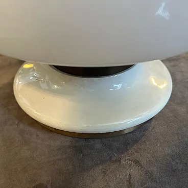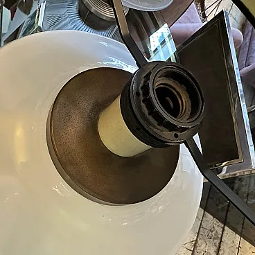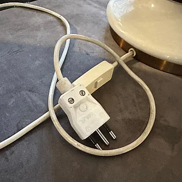 Vintage 1970s Mid-Century Modern White Opaline Glass and Brass Italian Table Lamp This elegant and classic table lamp from the 1970s is a beautiful example of Italian Mid-Century Modern design. The lamp features a sleek, sculptural body crafted from a single piece of high-quality white opaline glass. The glass has a subtle translucence, allowing for a soft, diffused glow when lit. The lamp's shape is both modern and timeless, with a flared base, a rounded central body, and a gently curved top. Complementing the white opaline glass are two polished brass accentsa ring at the base and a coordinating collar at the neck. The brass adds a touch of warmth and sophistication, creating a striking visual contrast with the smooth white glass. The lamp is shown with a new black tapered drum shade with gold fabric inside, which is often a classic pairing for this style, providing a clean and contemporary look. This piece would be a perfect addition to a living room, bedroom, or study, providing both ambient light and a stylish focal point. Its clean lines and luxurious materials make it suitable for a variety of decor styles, from modern and minimalist to Hollywood Regency. Excellent vintage condition. The opaline glass and brass show minimal wear consistent with age. The lamp is in working order, but like all vintage electrical items, it is recommended that it be checked by a qualified electrician.