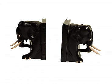 Beautiful pair of elephant bookends finely carved in ebony wood with inlaid tusks and bone nails of ... (I do not know ...) in perfect condition do not require of any restoration. Exact weight 1.124 kg and 1.198 kg.