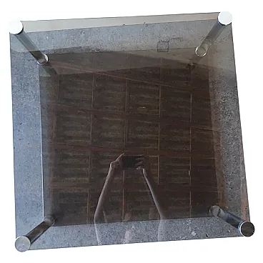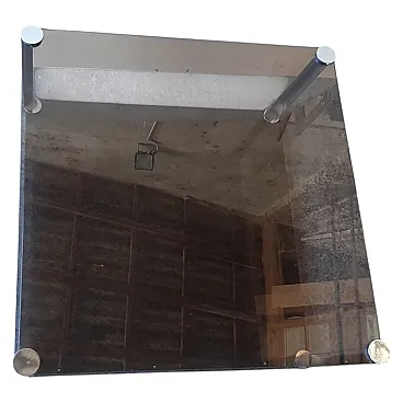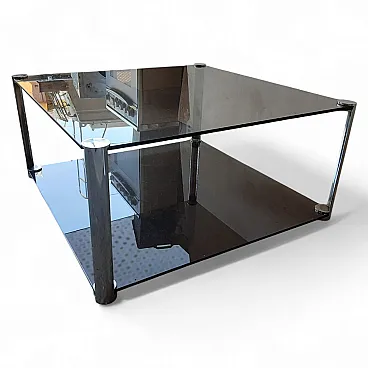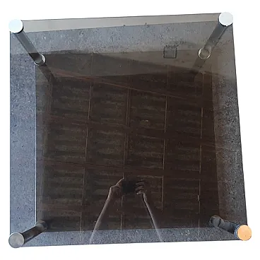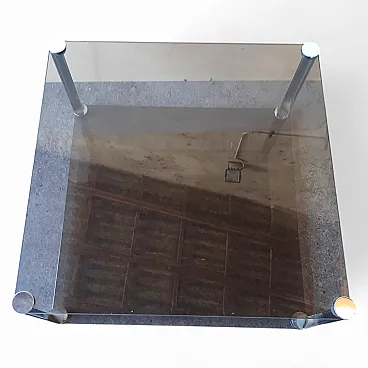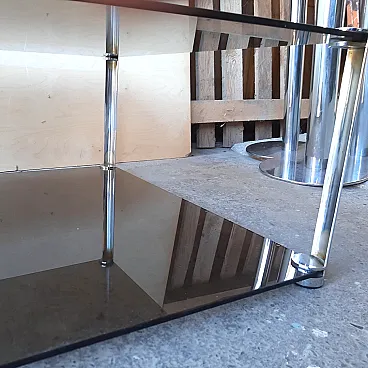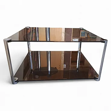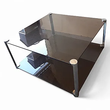 The chromed structure, with its clean and geometric lines, elegantly contrasts with the warm and enveloping shade of the smoke glass, giving the table a sophisticated and timeless aesthetic. The signature of Antonio Ari Colombo and the Arflex production attest to its authenticity and collecting value.