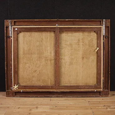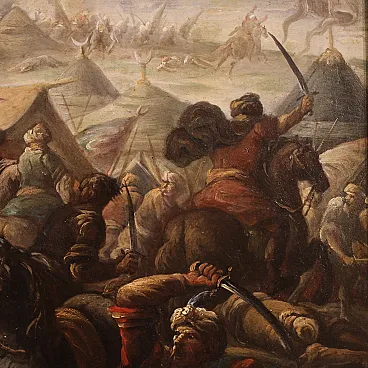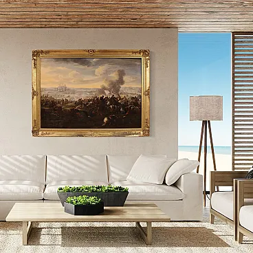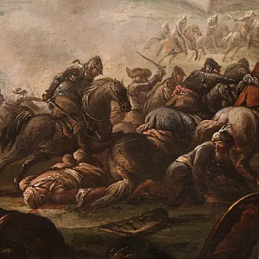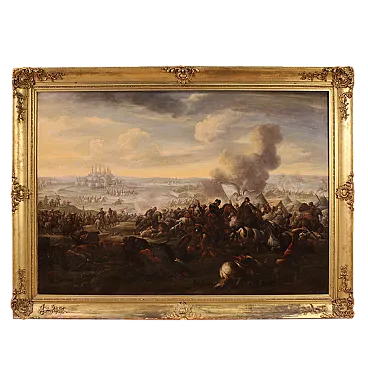 Imposing Italian painting of the first half of the eighteenth century. Oil work on canvas depicting the battle of Petervaradino, a historic and decisive clash between Christian and Ottoman armies fought during the Austro-Turkish war of 1716. Under the command of the imperial troops there was the feared Prince Eugene of Savoy, a true precursor of modern war. He was one of the best strategists of his time and personally led the attack on enemy camps by forcing them to a ruinous escape. The scene is set with an extraordinary baroque dynamic: on the background files of knights, in flames and cities fortified cities under siege while in the foreground a melee encounted to soldiers and overwhelmed horses gives the composition a strong dramatic sense. Picture attributable to the great Italian painter Pietro Graziani (1662-1731), specialized in battle scenes and views of sieges his works are distinguished by the descriptive wealth and theatricality, which transformed bloody clashes into heroic stories suitable for celebrating the military power of the Habsburgs. (The work is currently not accompanied by Expertise but it is possible to request it upon payment of the related additional costs). Rare painting and monumental dimensions, ideal for enriching large classic and modern representation environments. Scenographic setting of the 19th century in carved and golden wood, with some signs of time. Work already restored with Rintelo, replacement of the frame and color recovery in small points. Overall in good conservative state. Painted light H 120 x L 172 cm.