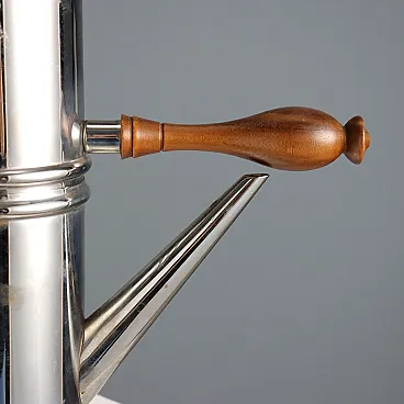 Double-chamber Neapolitan coffee maker from the Alessi "La Tavola di Babele" series, made of stainless steel with a Canaletto walnut handle and grip. Winner of the 1981 Compasso d'Oro Award. Manufacturer's mark stamped on the side.
