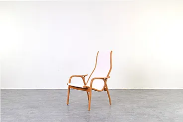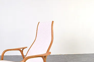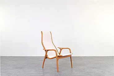 The Lamino easy chair was designed in the 1950s by the world-famous Swedish designer Yngve Ekström and was produced by the Swedish manufactory Swedese. The Lamino armchair is appreciated for its timeless design, which provides great sitting comfort, and thanks to the materials used, it makes the armchair very light. Wooden elements are made of bent oak wood and have been professionally and carefully restored by removing old coatings, staining and finishing with varnish. The seat and backrest are upholstered in beige woolen fabric.