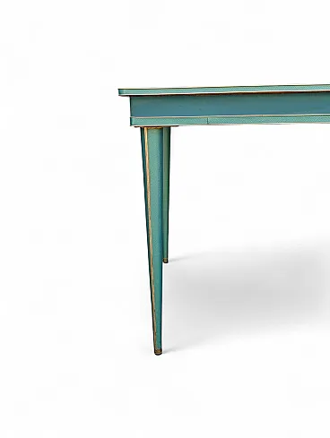 This rectangular dining table is a refined example of vintage design. The plane is elegantly finished with a double thin edge that combines the shades of water green and gold. This chromatic choice creates a sophisticated contrast and highlights the clean lines of the table.