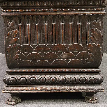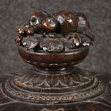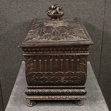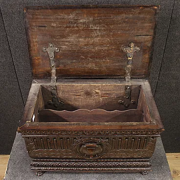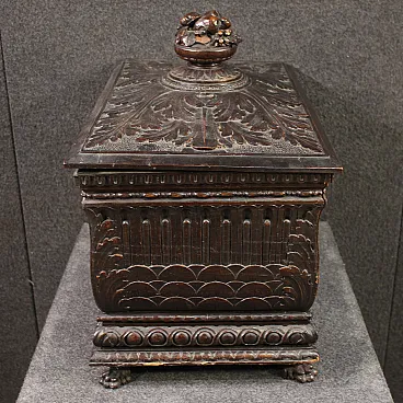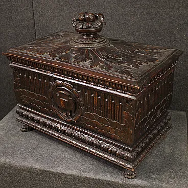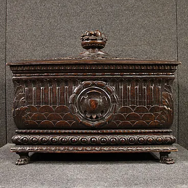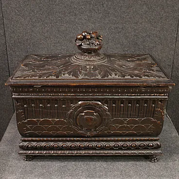 Small Italian trunk of the early twentieth century. Furniture finished by the center, in finely carved wood, in Renaissance style. Bauctic that is difficult to find both for quality and fabulous proportion. Mobile supported by four zoomorphic wooden feet, front decoration with noble coat of arms on both sides and rich cup with fruit in the upper part. Interior of discreet capacity, with removable wooden divider (see photo). Collectible object for antique dealers and furnishings, ideal to exhibit above a dresser or desk. In good condition.