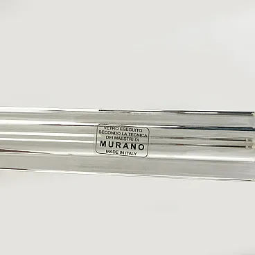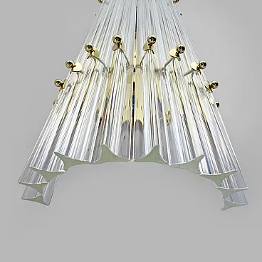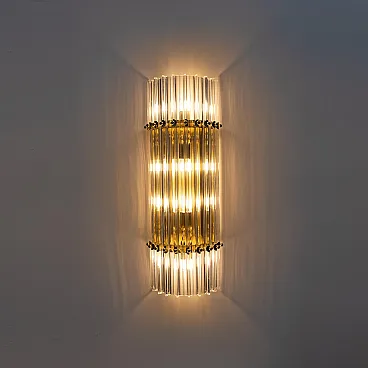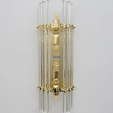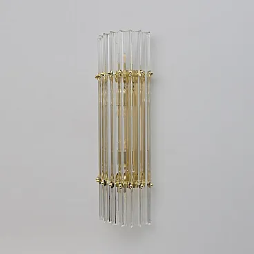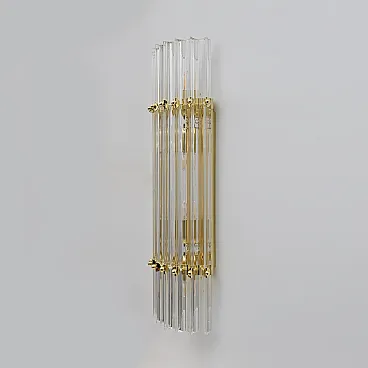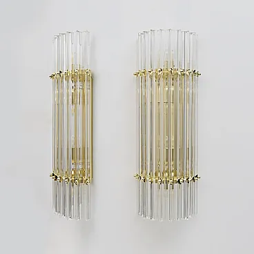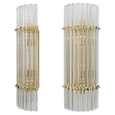 This pair of wall sconces consists of 10 Trihedrons, each in Murano crystal, crafted in the Venini style, with a brass and gold-plated metal frame. Four bulbs are required, with an E27 base for Europe or an E26 base for the United States. They operate at 110 or 220 volts. Please note that they have been rewired and UL listed. The mounting plate measures 42 cm high x 18 cm wide. These lamps were produced in the 2000s but have never been used. Additional pairs are available; please inquire about availability. We also sell in odd quantities; contact us for a quote. Additionally, upon request, our glassworks can produce larger quantities to meet your specific needs.