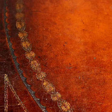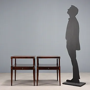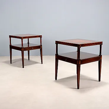 Pair of mahogany coffee tables or valet stands. The upper surface features a tanned and stamped leather insert, resting on turned and gouged columns on a lower surface with a drawer. Maple binding and inlays, truncated pyramidal legs. England, late 19th century.
