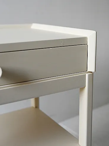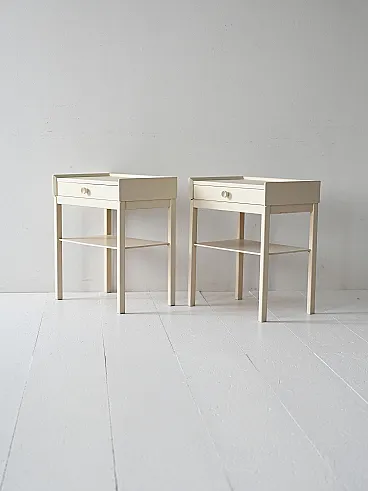 Pair of white lacquered vintage bedside tables, with drawer, shelf and simple structure with clean and light lines.