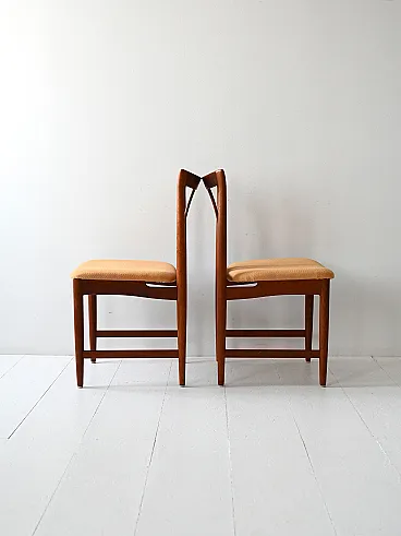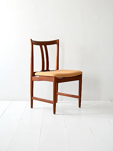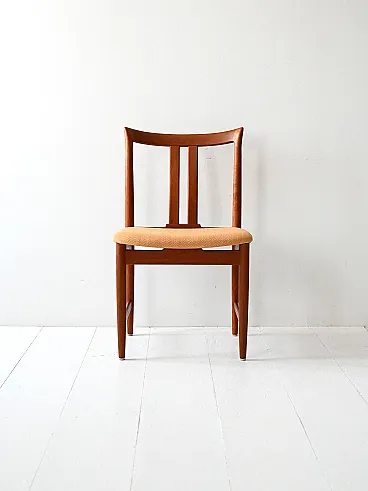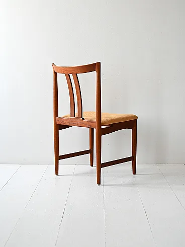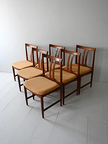 Set of six Scandinavian teak lunch chairs from the 1950s. The structure has turned legs and cured details, with a slightly curved back in the upper part for greater comfort. The proportions are sober, with a balance between solidity and lightness. The original Zabaione color tapestry is in good condition.