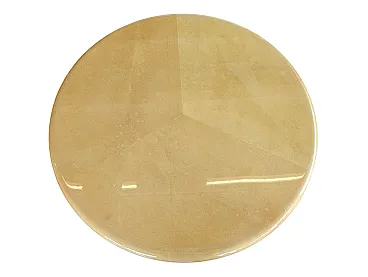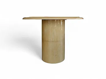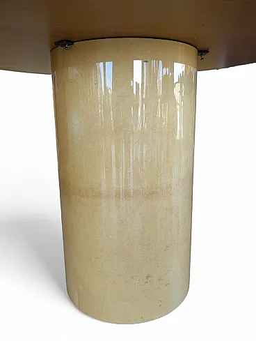 This is a monolithic round table with an imposing cylindrical column base, which recalls the style of Italian design as a high ture. It is characterized by a finishing (or lacquer with high brilliance) of beige/cream color, which covers a texture reminiscent of the parchment or a spotted marbled effect. The sculptural shape and the shiny coating make it a piece of furniture with a strong visual impact and a distinctive vintage-contemporary character. The conditions are perfect. Dimensions 75 x 100 cm (height, diameter) Sku OM2609252
