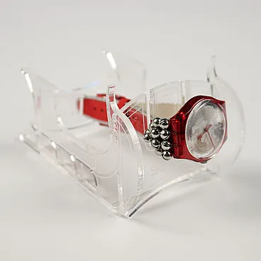 Swatch GZ408 Jingle Jangle X-Mas Special was the special Christmas gift of 2003, limited to 14,999 pieces worldwide. Sold in the original silver box, which contains the transparent sleigh resting on a red fabric and the watch acts as reins for the stuffed reindeer, which can be attached to the watch with a small suction cup. The silver dial depicts a reindeer, equipped with red hands and a date window at 12 o\'clock. Twelve small bells, similar to the rattles on reindeer harnesses, ring in rhythm with the movements of the arm at each end of the strap. The leather strap with a red fabric surface and a shiny silver edge is an additional visual highlight. In limited edition packaging. New, unused, and unworn Swatch watch. In original packaging. Watch with quartz movement, red strap edged in silver with silver bells, silver case, round red dial, red hands. Watch case size 34mm.