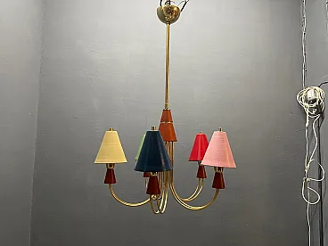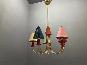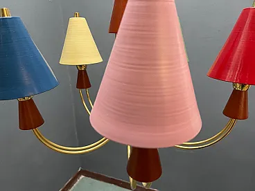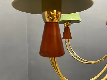 Further information on the article - Multicolor chandelier in brass, 5 lights, 80s this characteristic chandelier of the 80s combines bright colors with refined brass details. The central red wood element is taken up in the fittings under each lampshade, while the five aluminum lamps of different colors (yellow, blue, green, pink and red) give the piece a lively and eclectic character. The brass structure with its elegantly curved arms supports five lights designed for E14 bulbs. The chandelier emanates a warm and suggestive light rather than strong lighting, making it ideal to create a suggestive atmosphere. The electrical system has recently been installed, ensuring the possibility of immediate use. Details • period: 80s • Material: brass, aluminum, wood • colors: multicolored lampshade with red wooden accents • Dimensions: height 80 cm, width 45 cm, depth 45 cm • lights: 5 bulbs E14 • Conditions: Vintage, new electrical system installed