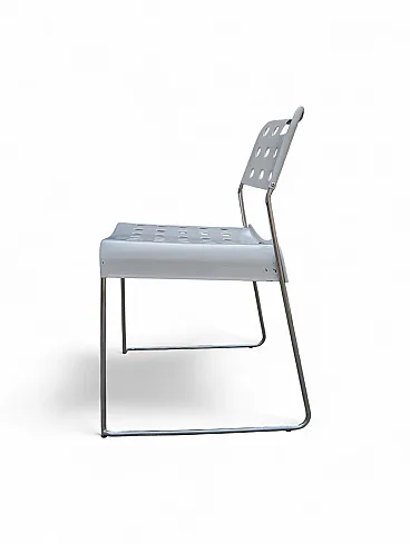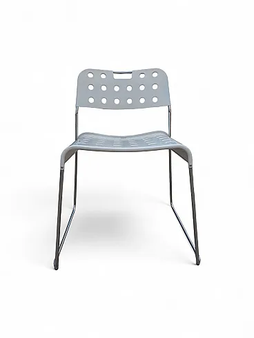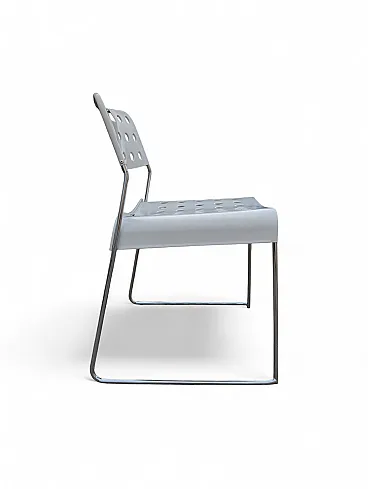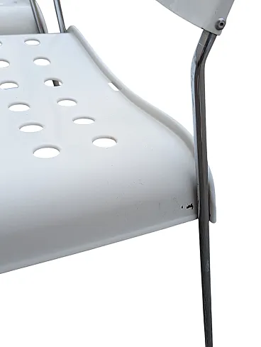 The chairs have a unique session and backstail made of perforated metal sheet (probably light painted steel), which guarantees lightness and a peculiar minimalist aesthetic. The supporting structure is in chromed metal tubular, designed for maximum stability and to allow easy and rapid stackability.