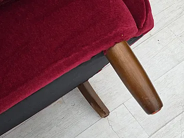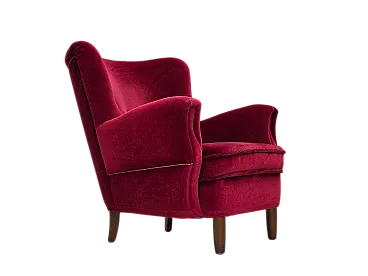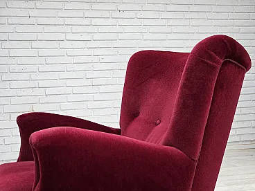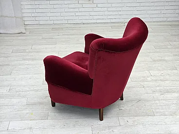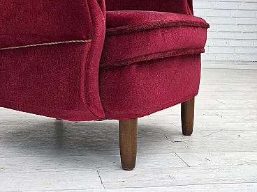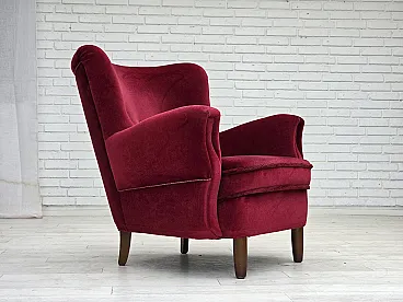 Danish armchair, cherry-red furniture velour, beech wood legs, 1960s
