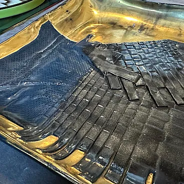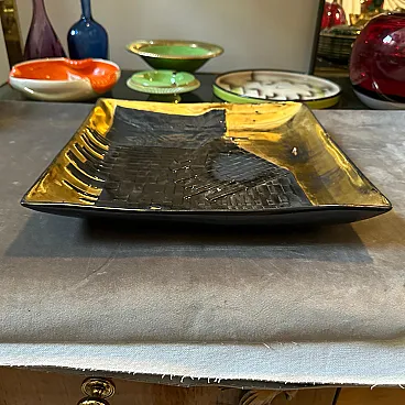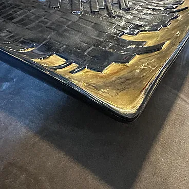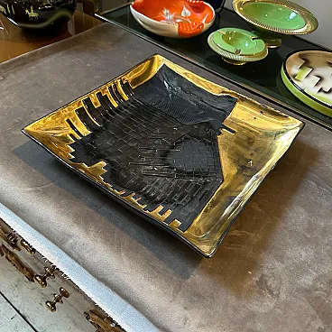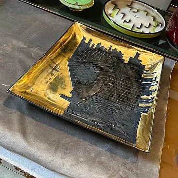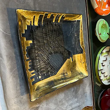 This piece is as functional as it is decorative. It is ideal for an entryway table, coffee table, or desk to hold keys, coins, or small objects. It also works beautifully as a standalone decorative object, adding a luxurious and artistic touch to any modern or vintage-inspired interior. The dish is in excellent vintage condition with no chips or cracks. There is some minor wear and patina to the gold finish, which is consistent with its age and adds to its character. This is a remarkable vintage vide poche (French for "empty pockets"), a true statement piece of Italian postmodern design from the 1980s. The piece is marked "Capodimonte" with the traditional crown and N, The dish has a distinctive, irregular square shape with a raised, sculptural relief. The design is a dynamic mix of geometric and abstract patterns, with a captivating contrast between the textured black surface and the shimmering gold.