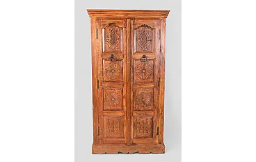 Charming antique wardrobe made of solid wood, characterized by craftsmanship rich in decorative details. The two doors feature panels carved with geometric and floral motifs, including rosettes and sunburst designs, enriched with wrought iron rings that serve as handles. The molded upper frame and shaped base give balance and proportion to the structure, emphasizing the authenticity of the traditional style.