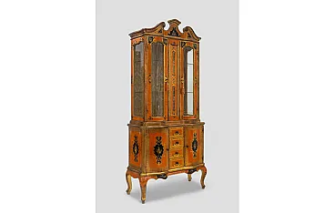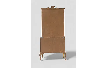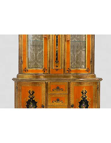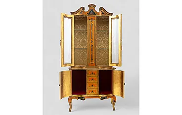 This charming vintage Tuscan display cabinet from the 1960s is a double-bodied piece of furniture that combines elegance and decorative richness. The curved and rounded design, together with the lacquered, gilded, and hand-painted details, make it a unique piece with great visual impact. The lower section is a sideboard with two doors and four spacious central drawers, while the upper section has two doors with working keys and two internal glass shelves, perfect for displaying precious objects. The interior is lined with refined damask fabric, which adds further sophistication to the piece.