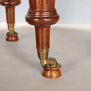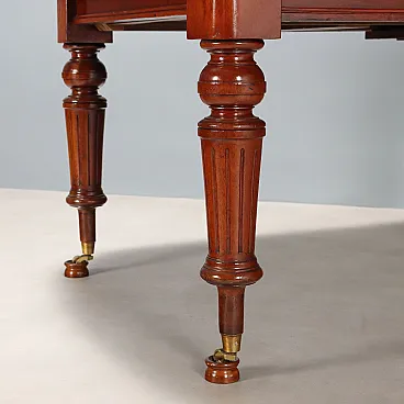 Mahogany table extendable by crank and rack. Four turned legs with gouges, topped with brass cups and casters. Wooden floor protectors, three extensions. England, late 19th/early 20th century.