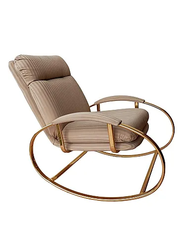 Refined Italian rocking chair designed by Guido Faleschini in the 70s, made of brass with original fabric pillow. The brass structure, elegant and solid, dialogue harmoniously with the sinuous lines of design. Guido Faleschini is an Italian designer and architect, active especially between the 60s and 80s. It is known mainly for its high quality furnishings, often made in collaboration with prestigious brands such as Imariani and Pace Collection (an American luxury design company). His style combines elegant lines, precious materials (such as brass, skin and precious fabrics) and a typically Mid-Century Modern taste with a touch of sober luxury. Faleschini represents that generation of Italian designers who led Italian furniture to be synonymous with elegance in the world.