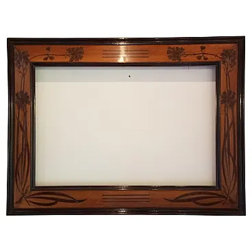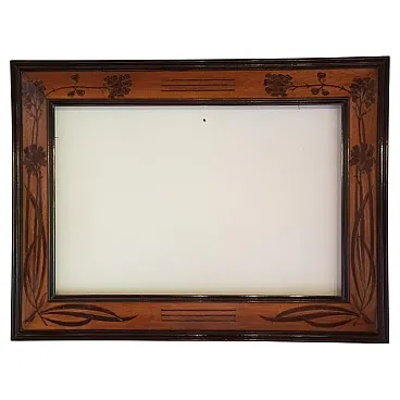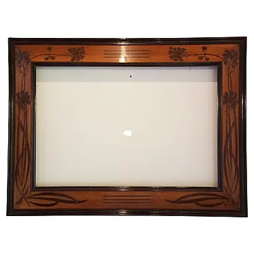 Frame with dimensions 126 cm. X 95 early 20th century, Austria - Vienna. The structure of the frame is made of fir wood, a material chosen for its lightness and workability, while the surface is finely veneered with layers of light and mahogany, precious woods appreciated for their chromatic heat and rich vein. This frame reflects the innovative aesthetic of the Viennese secession, artistic movement of that period, and the work of prominent figures such as Koloman Moser and Josef Maria Auccentaller both influential in the definition of the visual language of the movement. Many of their projects were published in the magazine Ver Sacrum, founded by Gustav Klimt and Max Kurzweil, who served as a showcase for the innovative ideas of the secession artists. The design of this frame fully reflects the aesthetic of the period, with floral motifs and essential lines. This balance between decoration and simplicity creates a sense of harmony that characterizes the entire structure. Interior of the frame 93 cm. x 62 cm. Frame 126 cm. x 95 cm. x depth of 6.5 cm. The width of the wooden frame is 15 cm.
