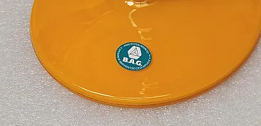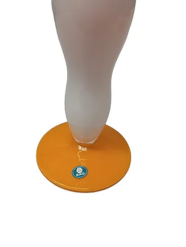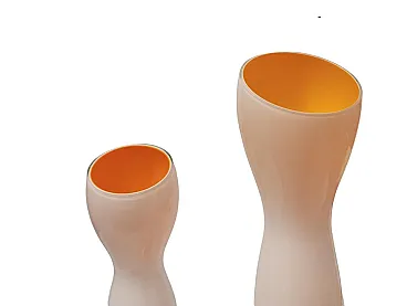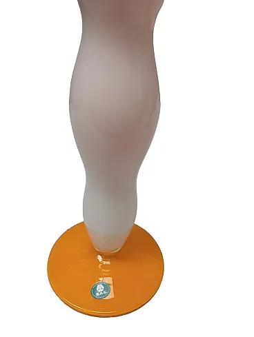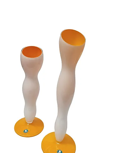 Pair of vases made in Czechoslovakia (displaced headquarters) under the Barovier and Toso B.A.G brands, dating back to the 1980s. They are blown glass artefacts worked with the casing technique, which involves the immersion of a glass already in process in a crucible containing glass of different colours, thus creating a uniform and precious coating. The design is characterized by its slender and sinuous shape, with a circular base in intense yellow glass and body in milky white glass, while the interior is colored in a warm yellow which enhances its brightness. The color combination and workmanship give the pieces an elegant and at the same time decisive appearance, typical of the artistic production of the 1980s. With original label. The Barovier dynasty was born in Murano in 1295 and in 1942 it became Barovier & Toso, one of the most prestigious glassworks on the island. Under the leadership of Ercole Barovier (1889–1974) the company combines tradition and innovation: from Art Nouveau chandeliers to modernist creations such as the Pezzato, the Barbarico and the Oriente. Even today, the family maintains control and the brand is a symbol of the excellence of Murano glass.