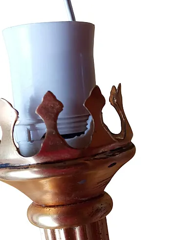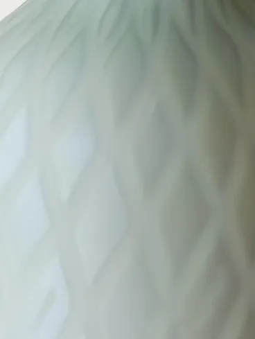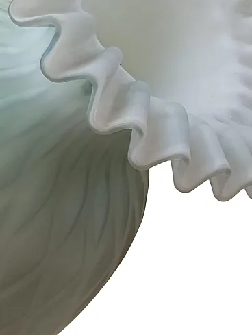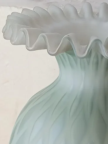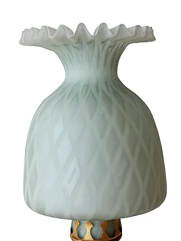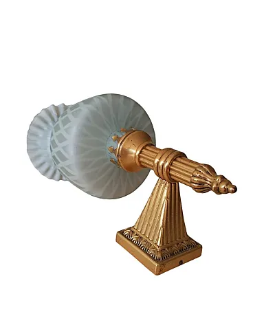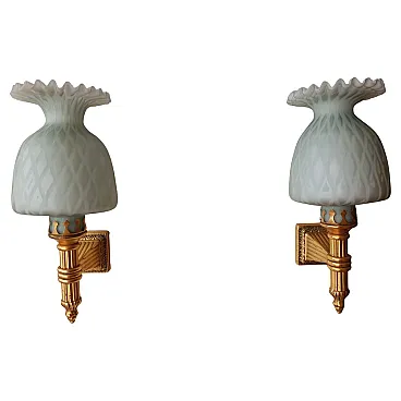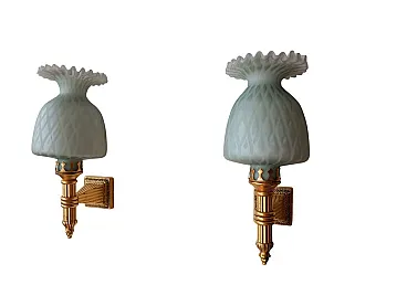 1970s French wall sconces in golden brass and satin glass, have a square base with ornamental engravings while the arm is in golden brass with a decorative design rich in details and motifs in relief, which recalls decorative torches. The lampshade is made of sage green colored glass and features diamond decorations. The shape is particular: it widens upwards and ends with a wavy and jagged edge that resembles an open flower, it is white inside. Dimensions h 26 cm. X depth 16 cm. X width 11 cm. Small defects visible in the last two photos.