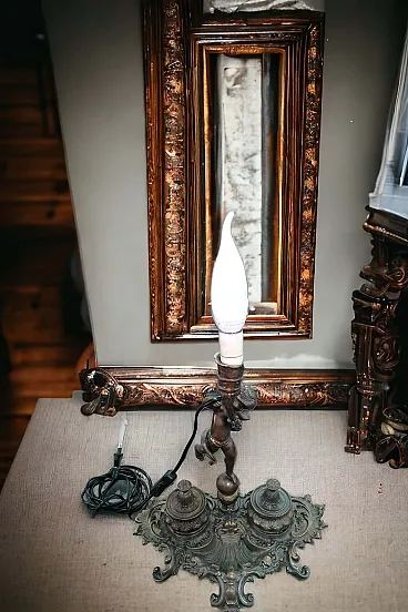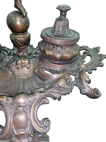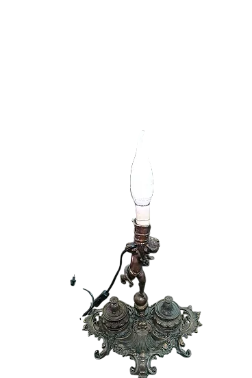 The bronze inkwell lamp featuring a putto is a piece of significant artistic and historical value, designed to combine functionality with beauty. This captivating object is not merely a holder for pens and ink, but a masterpiece that enriches any space with its timeless charm.