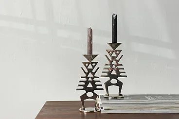 A set of two candle holders made of metal with a polished surface, designed in a modernist style. Their form is inspired by geometric and abstract motifs – cut-out shapes of triangles, circles, and straight lines form an almost totemic silhouette, reminiscent of tribal figures or modernist sculptures. The candlesticks have a solid base and conical candle holders, which give the whole piece an elegant lightness. The polished metal beautifully reflects light, creating an additional decorative effect. These are unique examples of 1960s/1970s design, combining the functionality of an everyday object with an artistic, sculptural character. Perfect for mid-century, modernist, or eclectic interiors.