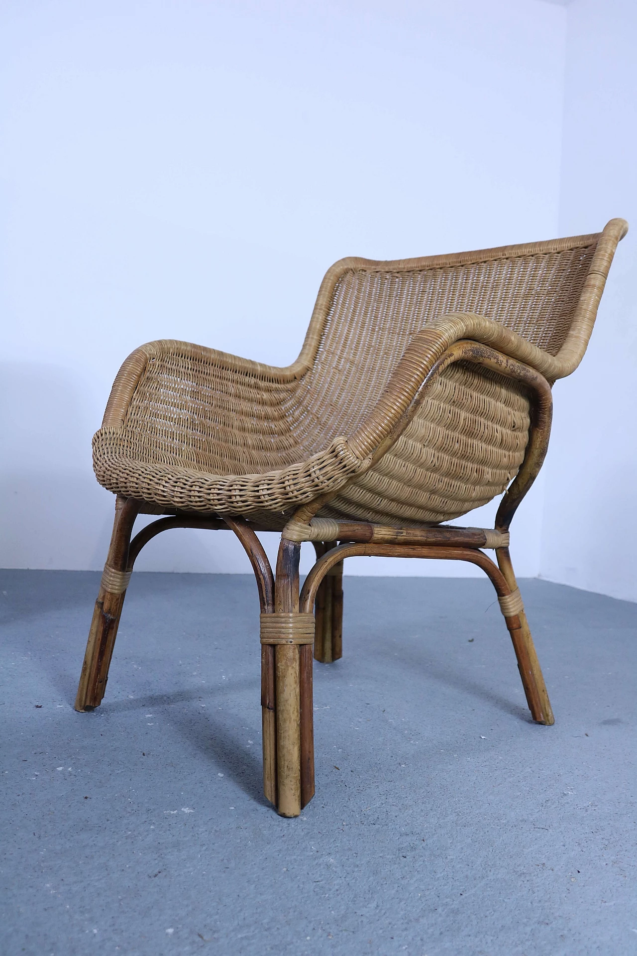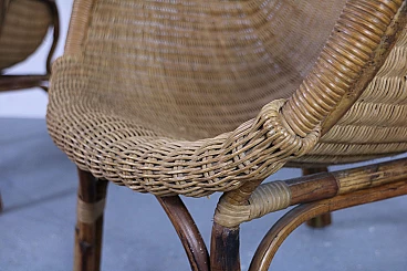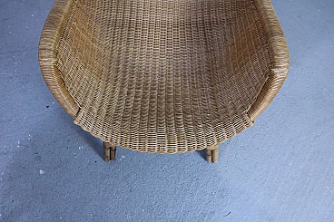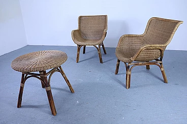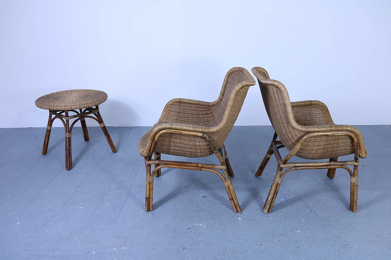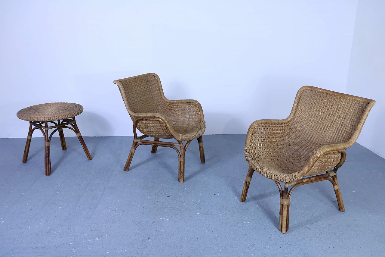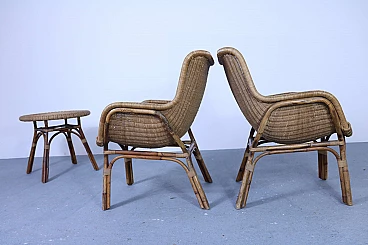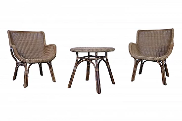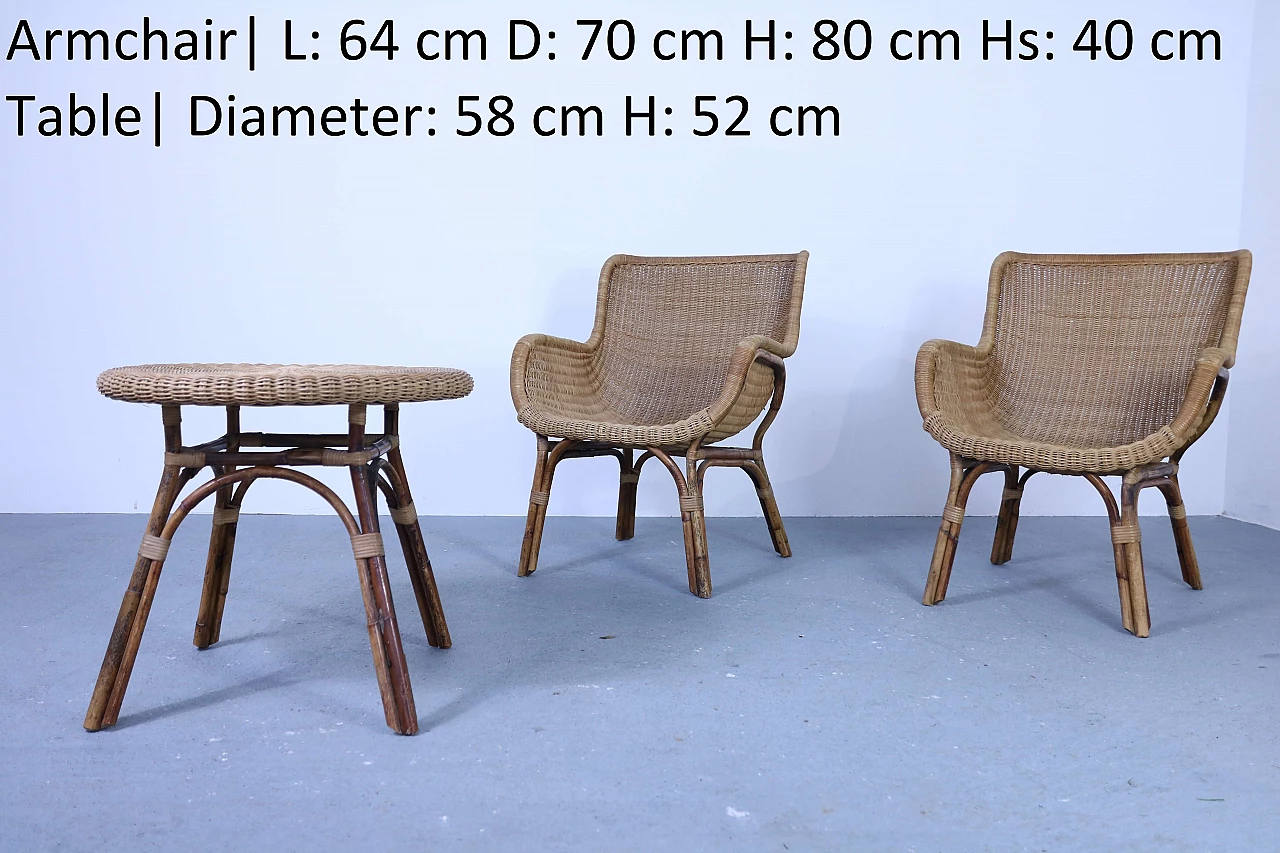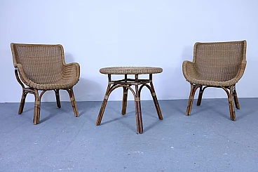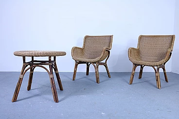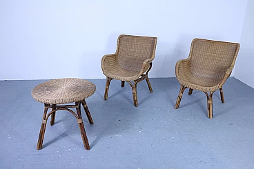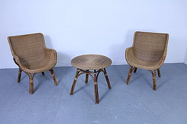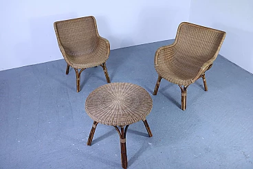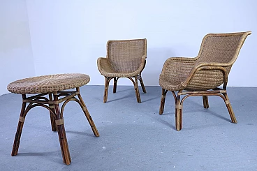 Set of 2 wicker armchairs and 1 coffee table, 50s