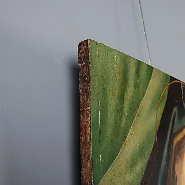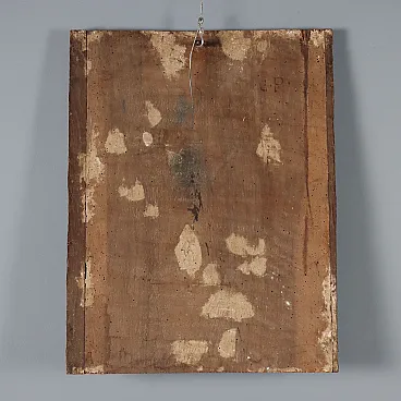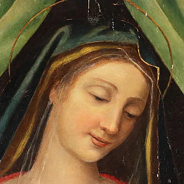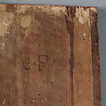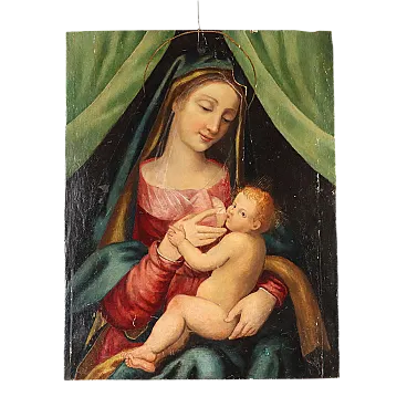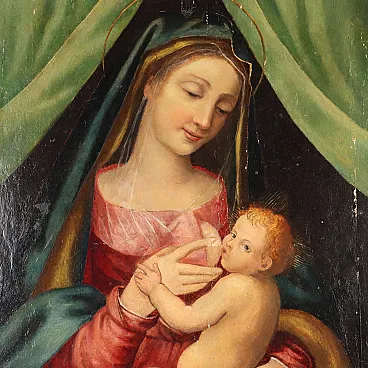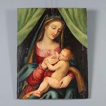Oil on walnut panel. The painting follows early 16th-century Tuscan models (for example, the pictorial style of Domenico Puligo), but is a slightly later production and by a weaker hand, typical of \"peripheral\"production. The absolutely traditional subject features the Madonna breastfeeding the Baby Jesus, framed by a curtain; the infant, sucking at his mother\'s breast, looks toward the viewer, while the mother gazes tenderly at her son. The monogram CP appears on the back of the panel, likely indicating the artist. The panel has several small paint losses.